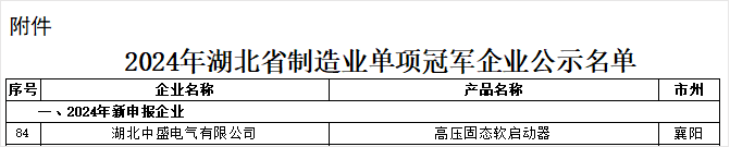 近日,湖北省經(jīng)濟(jì)和信息化廳發(fā)布《關(guān)于2024年度湖北省制造業(yè)單項(xiàng)冠軍企業(yè)名單的公示》,湖北中盛電氣有限公司獲評“2024年湖北省制造業(yè)單項(xiàng)冠軍企業(yè)”。